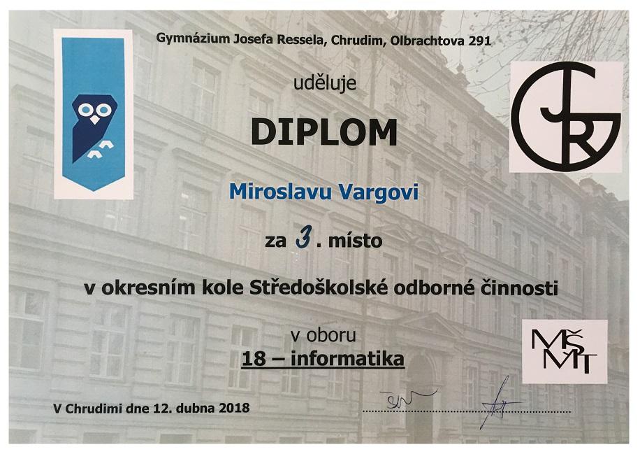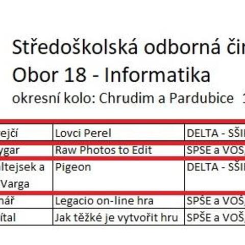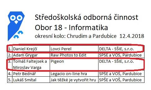 Chrudim, 12.4.2018: Letošního 40. ročníku středoškolské odborné činnosti se v oboru Informatika v okresech Pardubice a Chrudim účastnilo celkem 5 projektů. Studenti ze soukromé školy informatiky a ekonomie DELTA se předvedli ve výborném světle. Daniel Krejčí zvítězil a Tomáš Faltejsek s Miroslavem Vargou skončili třetí. Dan Krejčí zároveň postupuje do krajského kola, kde mu budeme držet palce.
