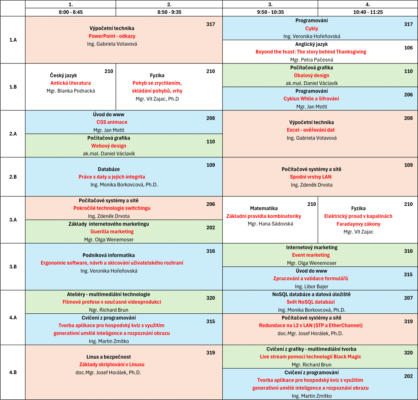 Barevný kód: modrá pole jsou předměty z oblasti programování, zelená pole patří ke grafice a marketingu, ostatní informatické předměty jsou ve světle oranžové, všeobecně-vzdělávací předměty v bílé