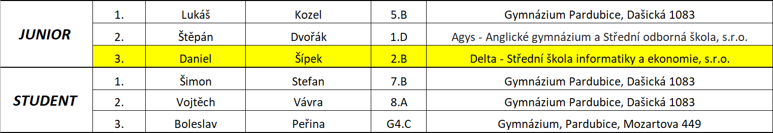 Matematické soutěže jako olympiády nebo právě klokana si lidé obvykle spojují se studenty gymnázií. Máme radost, že tuhle gympláckou dominanci narušuje Daniel Šípek ze druháku a blahopřejeme.