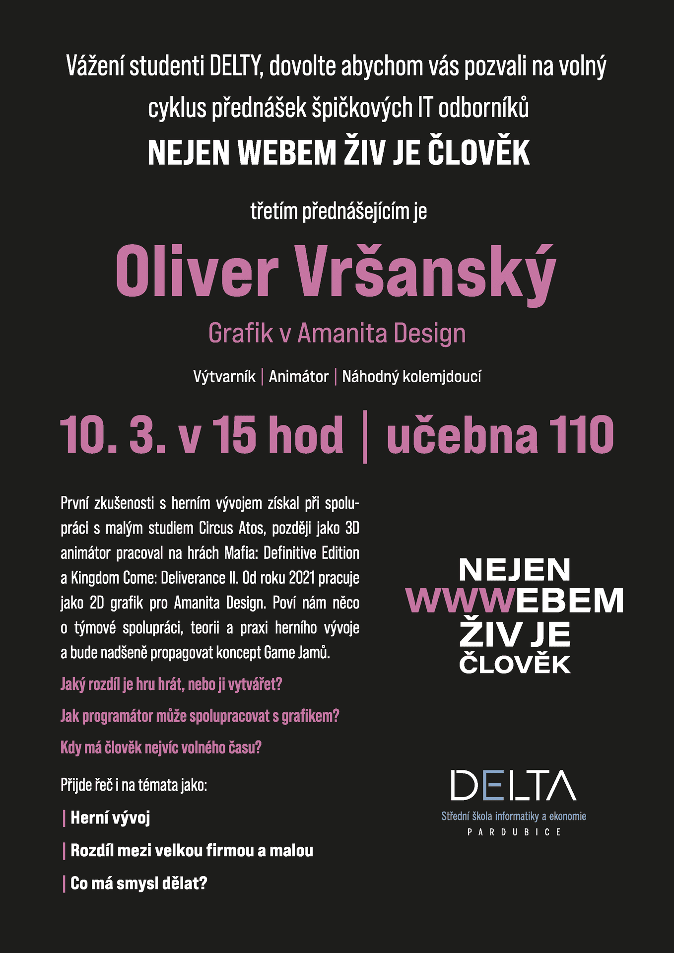 Nejen webem živ je člověk je volná série přednášek, kterou pořádá Delta pro svoje studenty a zve na ni odborníky z různých oblastí IT. Pod nálepkou „ajťák“ si totiž spousta lidí představí shrbeného kodéra, který se krčí nad klávesnicí, píše kód, a na konci z toho bude buď web nebo mobilní aplikace . My ale chceme ukázat svět informačních technologií jako krajinou plnou možností a příležitostí a především jako prostor, ve kterém se vyskytují zajímaví lidé a dělají úžasné, a hlavně různorodé věci.